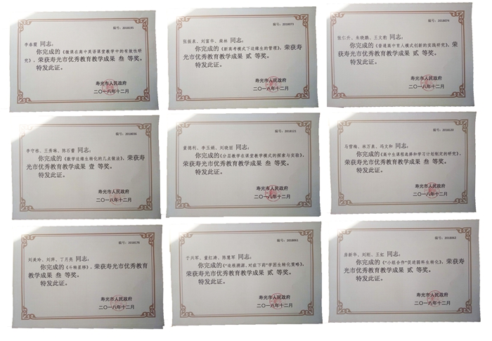 新年开局,又一份值得自豪的喜讯:1月16日,学校教科研中心收到了2018年度寿光市优秀教育教学成果奖评选获奖证书,李守栋、房新华、于兴军等老师的参评成果具以其独创性、新颖性、实用性等优势,被寿光市人民政府授予优秀教育教学成果奖,获奖率达80%,成为同类学校中获奖人数最多、获奖率最高的学校。其中,李守栋、王秀琳、陈石蕾老师的《数学边缘生转化的几点做法》荣获一等奖,房新华、刘刚、王虹等12名老师获得二等奖,李春霞、马雪梅等12名老师获得三等奖。
