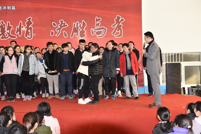 台上热情洋溢,台下摩拳擦掌。终于等来了互动环节,同学们纷纷冲上演讲台,大声喊出自己的人生理想和高考目标。“我相信,我能行”、“不抛弃不放弃”的精神如火焰燃烧着整个体育馆。34班班主任郝光永老师对学生的拥抱与鼓励,更是让全场同学们流下了热泪。