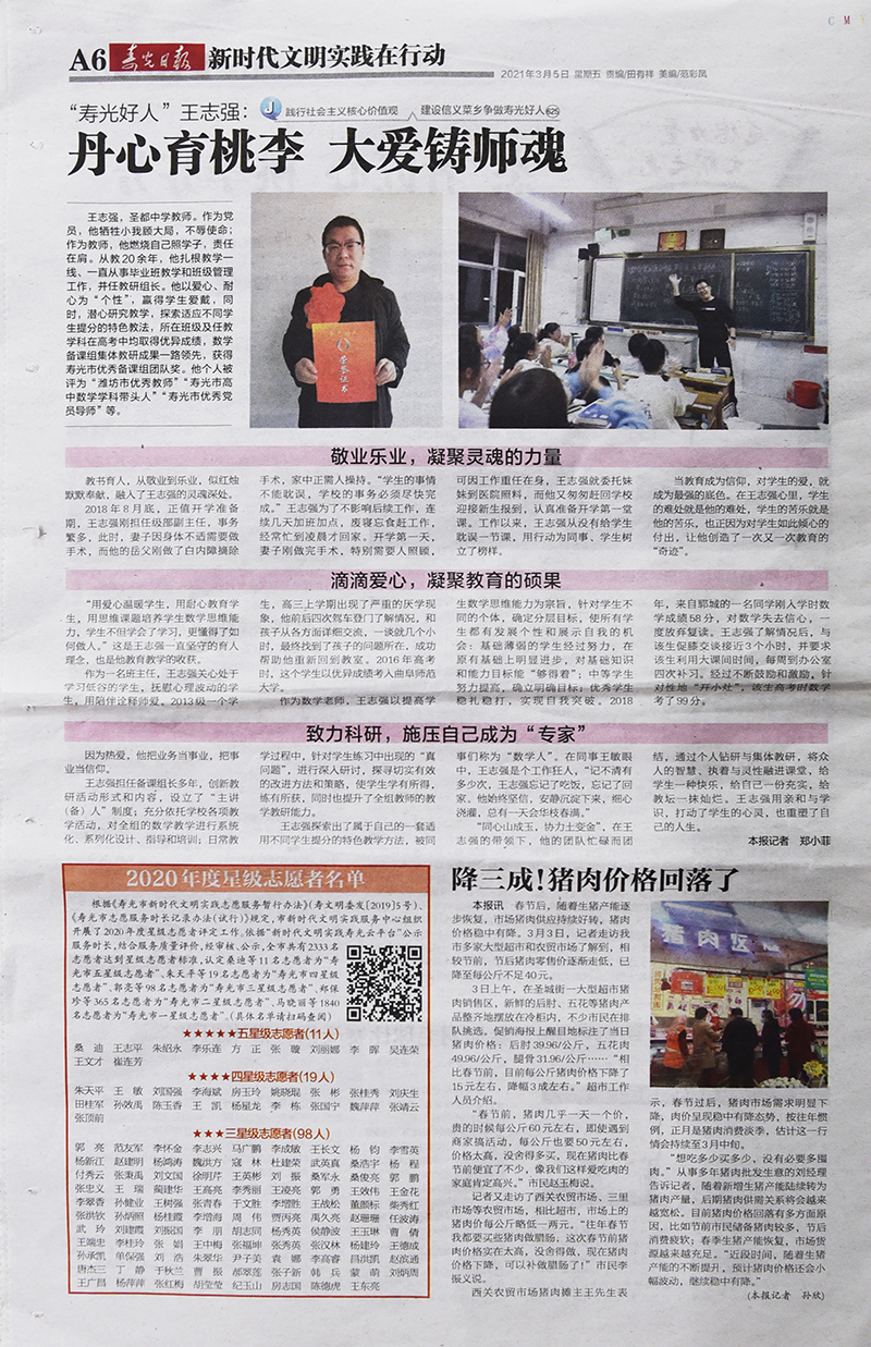 3月5日,寿光日报A6版头条以《“寿光好人”王志强——倾情育桃李,丹心系课堂》为题,从敬业乐业,凝聚灵魂的力量;滴滴爱心,凝聚教育的硕果和致力科研,施压自己成为“专家”三个方面,详细报道了“寿光好人”、圣都中学教师王志强勇担当、敢创新、爱生如子的事迹。