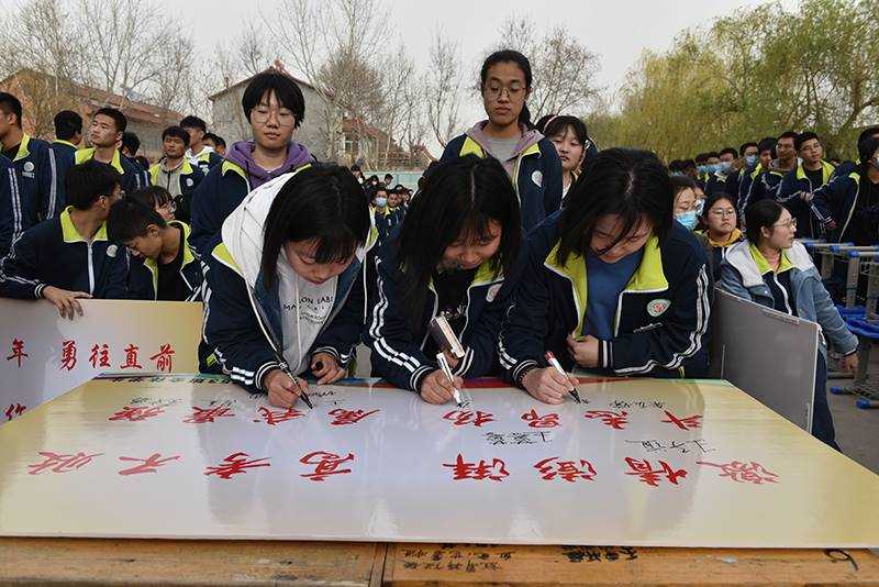 十载寒窗、勤学苦练,何人健步登金榜?一腔热血、万丈豪情,我辈立志夺桂冠。在李雨凝同学的带领下,全体起立,发出努力拼搏、我命由我不由天的铮铮誓言,并在宣誓版面上,郑重签下自己的名字,向高考宣战,向自己宣战。