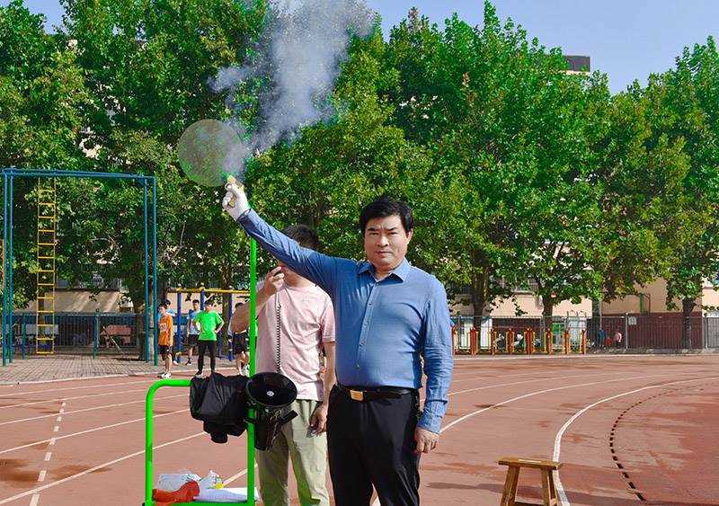 宣布2021年秋季田径运动会开幕后,李耀华校长手握发令枪,打响了秋季田径运动会第一枪。