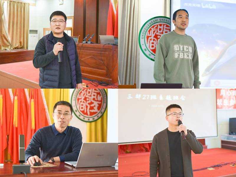 四位班主任代表依次上台展示主题班会:李新春老师用歌曲《少年中国说》为同学们赋志,要珍惜当下,决战未来;潘正伟老师以视频《鹰的重生》告诉同学们只有历涅槃之痛,才能获重生之美;刘金刚老师为班里每位同学带来家长的一封信——“写给正在努力的你”,勉励大家要立足现在,拼搏进取,超越自我才是对父母最大的回报立足现在;王文豹通过电影《长安三万里》和华为mate60现代通信移动技术背后彰显的“爱岗、奉献、吃苦、认真、学习”的精神谱系,鼓励同学们要心有长安,增强民族自豪感和自信心,厚植家国情怀。