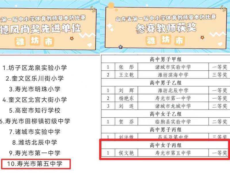 2023年9月,在寿光市体育教师基本功比赛中,侯文艳、李鹏、郑磊、韩海青、隋永明、张洁等六名体育老师参加,均获得寿光市奖项,其中侯文艳老师代表潍坊市参加山东省体育教师基本功比赛,获得山东省体育教师基本功比赛一等奖、第一名。学校被评为山东省教师基本功比赛道德风尚奖先进单位。
