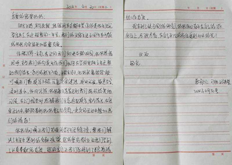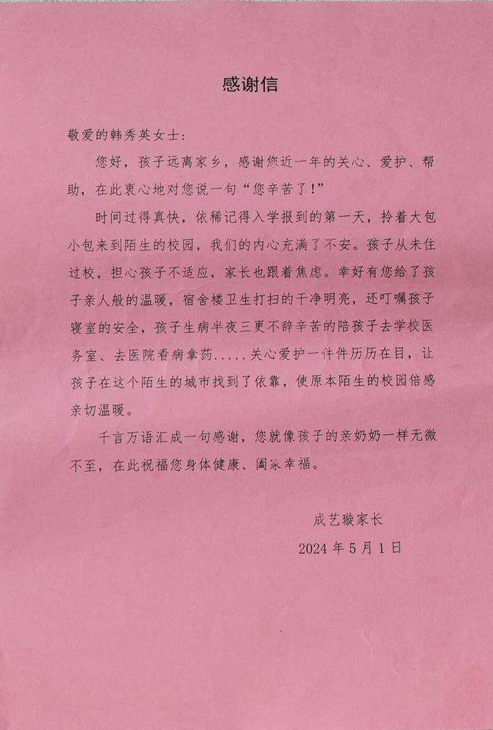 8号楼楼管员韩秀英,多年来秉承“责任为天”的圣都精神,把学生们当成自己的孙女关心爱护,无微不至。正如信中所说,宿舍楼每天都打扫得干净明亮,每日清晨都给予孩子们满怀微笑的问候;随时随地的叮嘱,让紧张的学习生活变得有条不紊;半夜三更不辞辛苦陪孩子们去医务室看病拿药,用爱心温暖着每一个离家在外的孩子,被学生们亲切地称为“韩奶奶”。