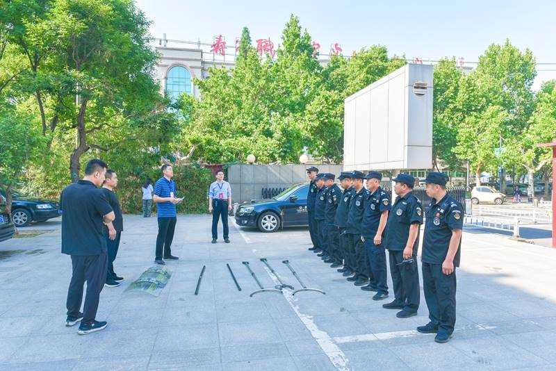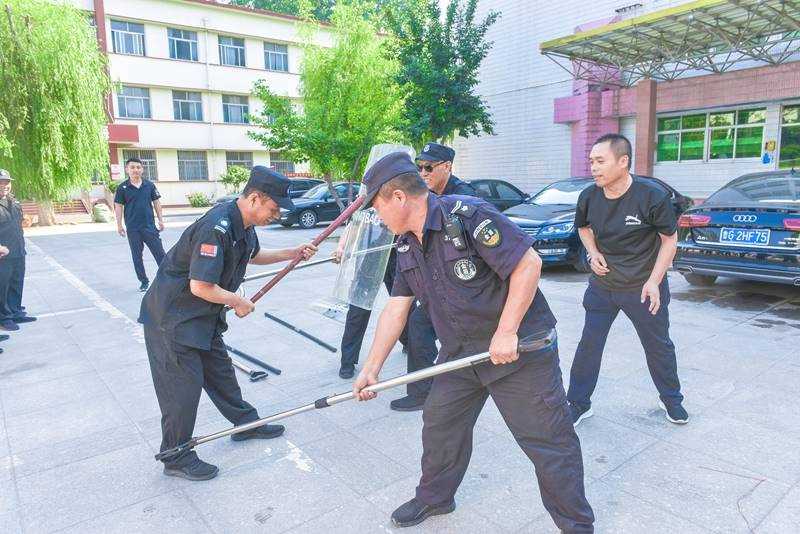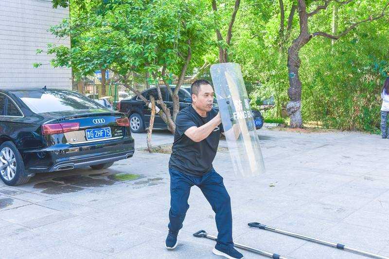 赵学磊为安保人员介绍了暴力事件的常见类型及应对技巧,详细演示了警用盾牌、警棍、钢叉等重要设备的构成及使用。随后,在赵教官指导下,现场开展了单人进攻与防范、多人合围等实战演习。参训人员态度端正、训练认真、动作规范,顺利完成实景应急演练。