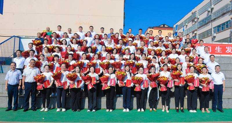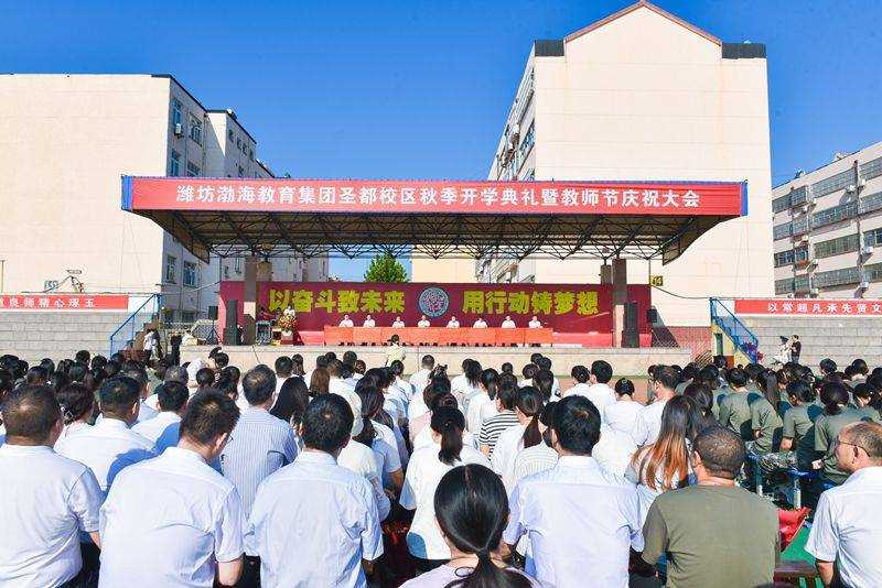 9月9日上午,潍坊渤海教育集团圣都校区开学典礼暨教师节庆祝大会在体育场举行。党委书记何祥坤深情致辞,党委副书记、副校长锡洪武宣读表彰决定,陈杰、田金桐两位老师主持典礼,隋晓璇老师代表教师发言,周奕萱 、赵晨旭、 郝晨斐、 田凯雨四位同学献词,全校两千多名师生参加。