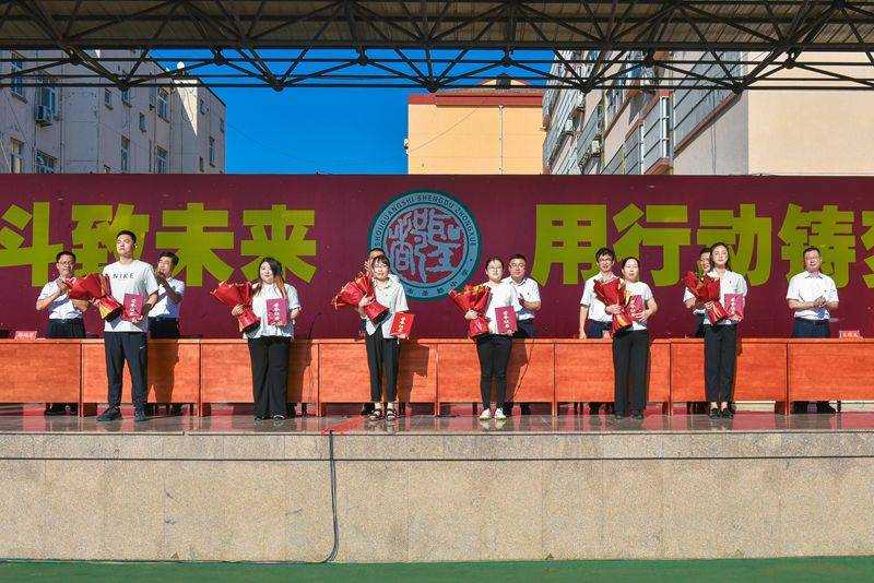 典礼在庄严的国歌声中拉开帷幕,学生代表上台献词。锡洪武副书记宣读《潍坊渤海教育集团圣都校区关于表扬2023-2024学年度立德树人先进个人的决定》。主持人宣读获奖名单,获奖者依次上台,学校领导班子为获奖者颁奖。