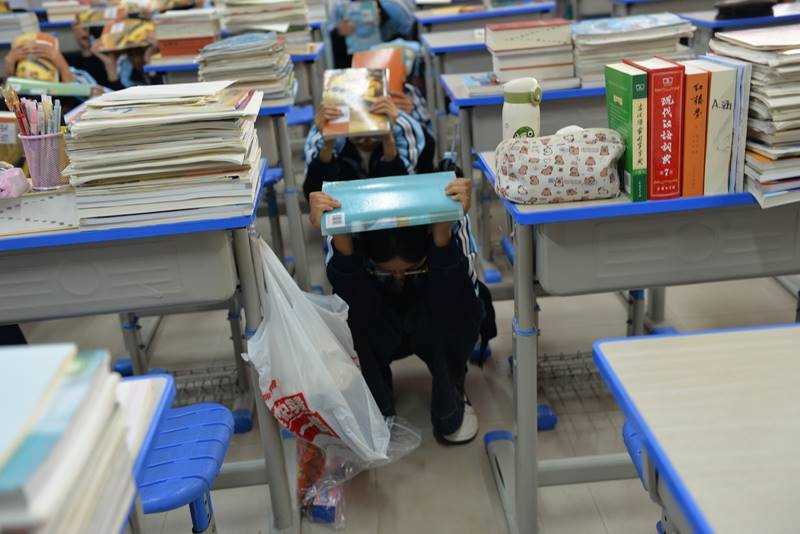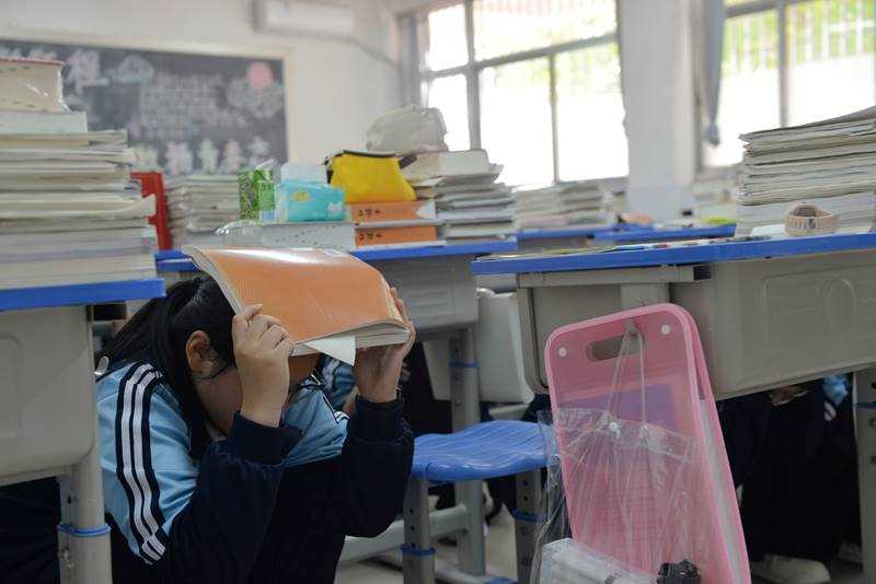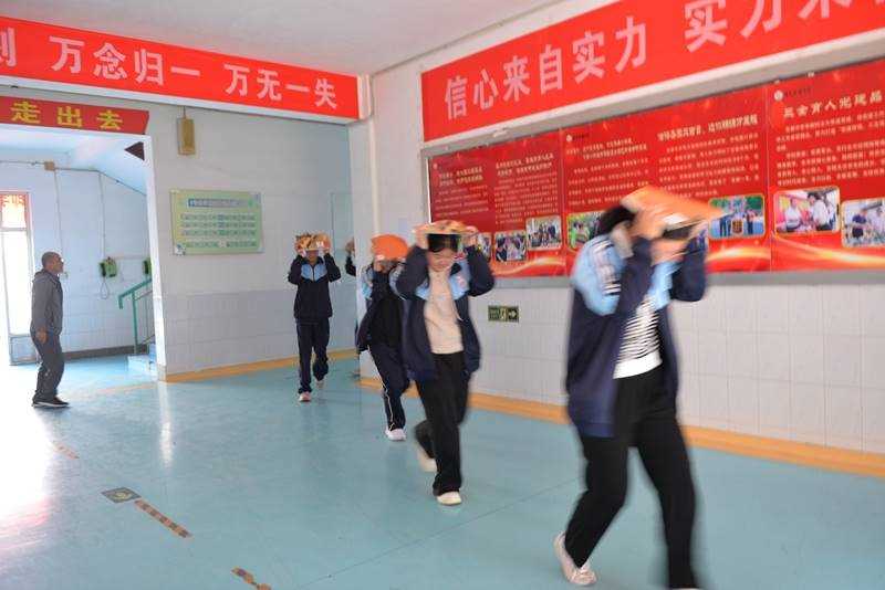 上午10点,第一次警报声响起,演练正式开始。全体师生立刻停止一切活动,迅速就近躲避在重心较低且结实牢固的桌底、墙角或支撑结构较多的空间,尽量蜷曲身体、降低重心、双手护头,进行紧急避险。当第二声警报响起,各值班教师立即到位,迅速打开教学楼前后门,引导学生有序疏散。各班学生按照“谁近谁先,先低后高”的原则,分两路纵队沿楼梯两侧依次疏散。整个过程,师生配合顺畅,快速、安全、有序地撤离到安全位置,用时2分10秒。