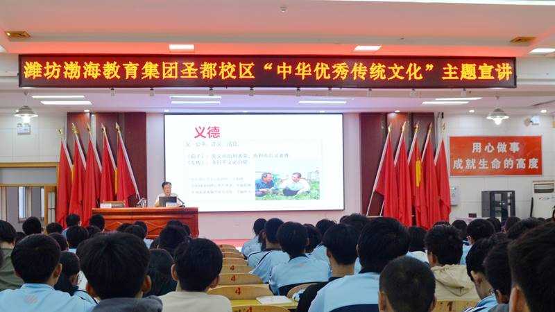 为进一步丰富校园文化生活,提高师生文化自信和人文素养,10月16日下午,潍坊渤海教育集团圣都校区“中华优秀传统文化”主题宣讲活动在学术报告厅东厅举行。寿光市委党校原党委书记、常务副校长,现寿光市优秀传统文化讲师团化龙分团团长金树亮同志受邀到校宣讲,党委委员刘兴旺主持并作总结发言,相关科室人员、高一年级全体班主任和学生参加。