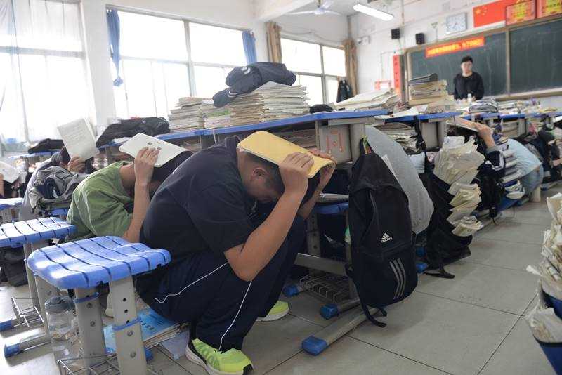 下午3点45分,地震警报声响起,演练正式开始,全体师生立刻停止一切活动,迅速就近躲避在重心较低且结实牢固的桌底、墙角或支撑结构较多的空间,尽量蜷曲身体、降低重心、双手护头,进行紧急避险。当第二声疏散警报响起,各值班教师立即到位,迅速打开前后门,引导学生有序疏散。各班学生按照“谁近谁先,先低后高”的原则,分两路纵队沿楼梯两侧依次疏散。整个演练过程稳中有序,师生配合顺畅,高效、迅速地撤离到预定安全位置,用时2分3秒。